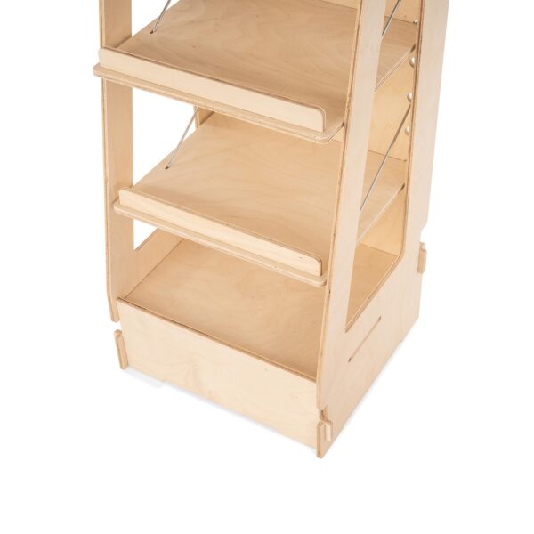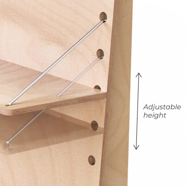 Ogni ripiano supporta fino a 9 kg, permettendo l’esposizione sicura di articoli vari come quaderni, barattoli e confezioni artigianali.