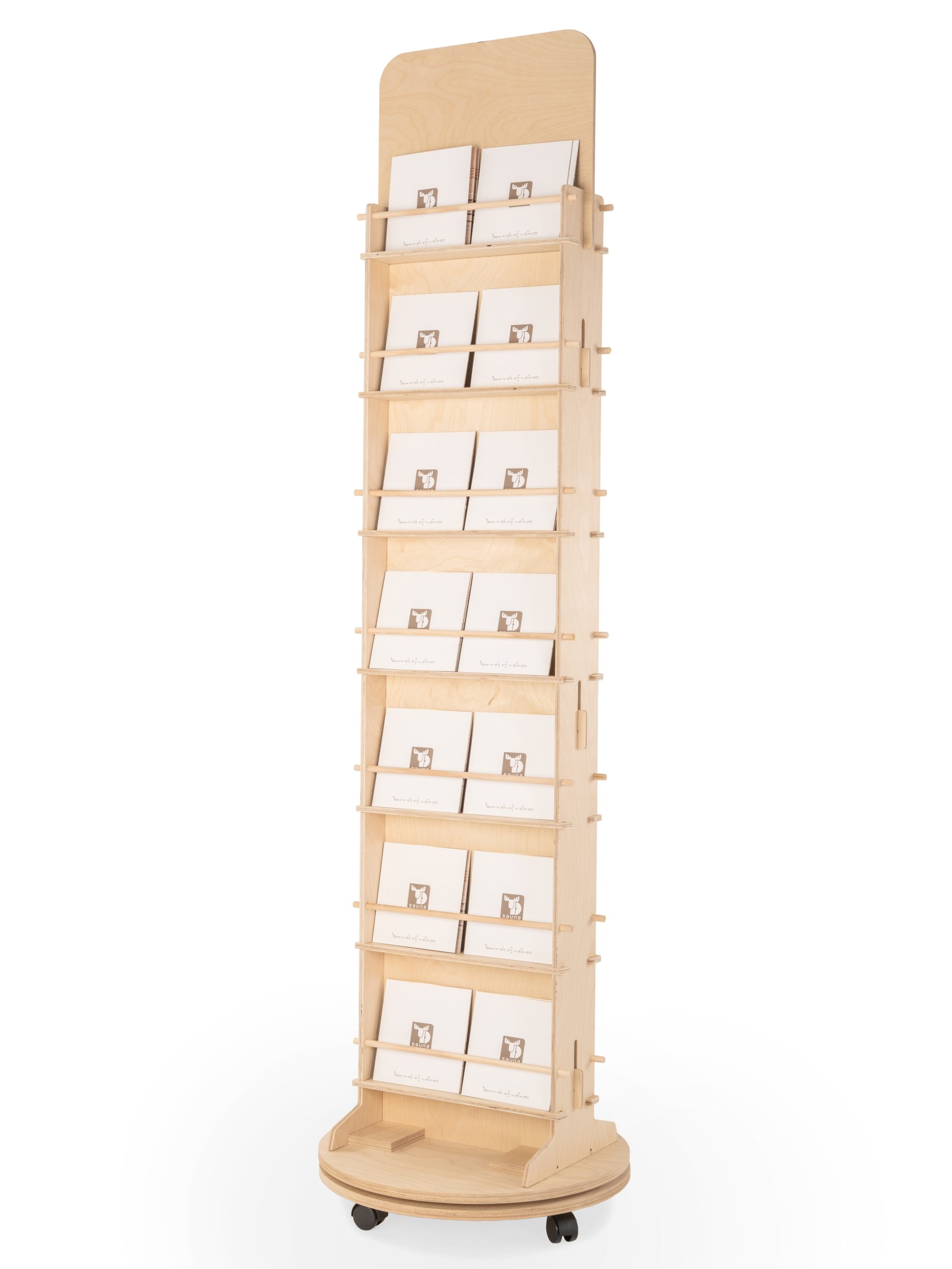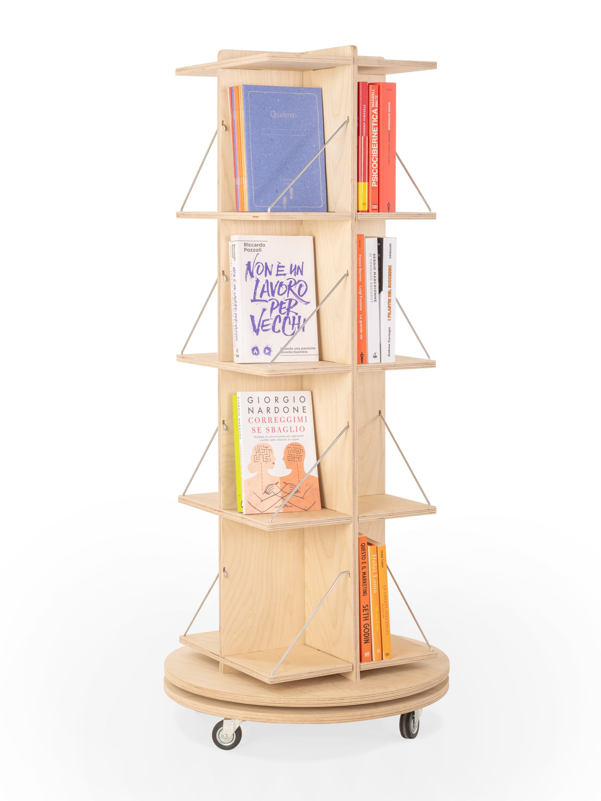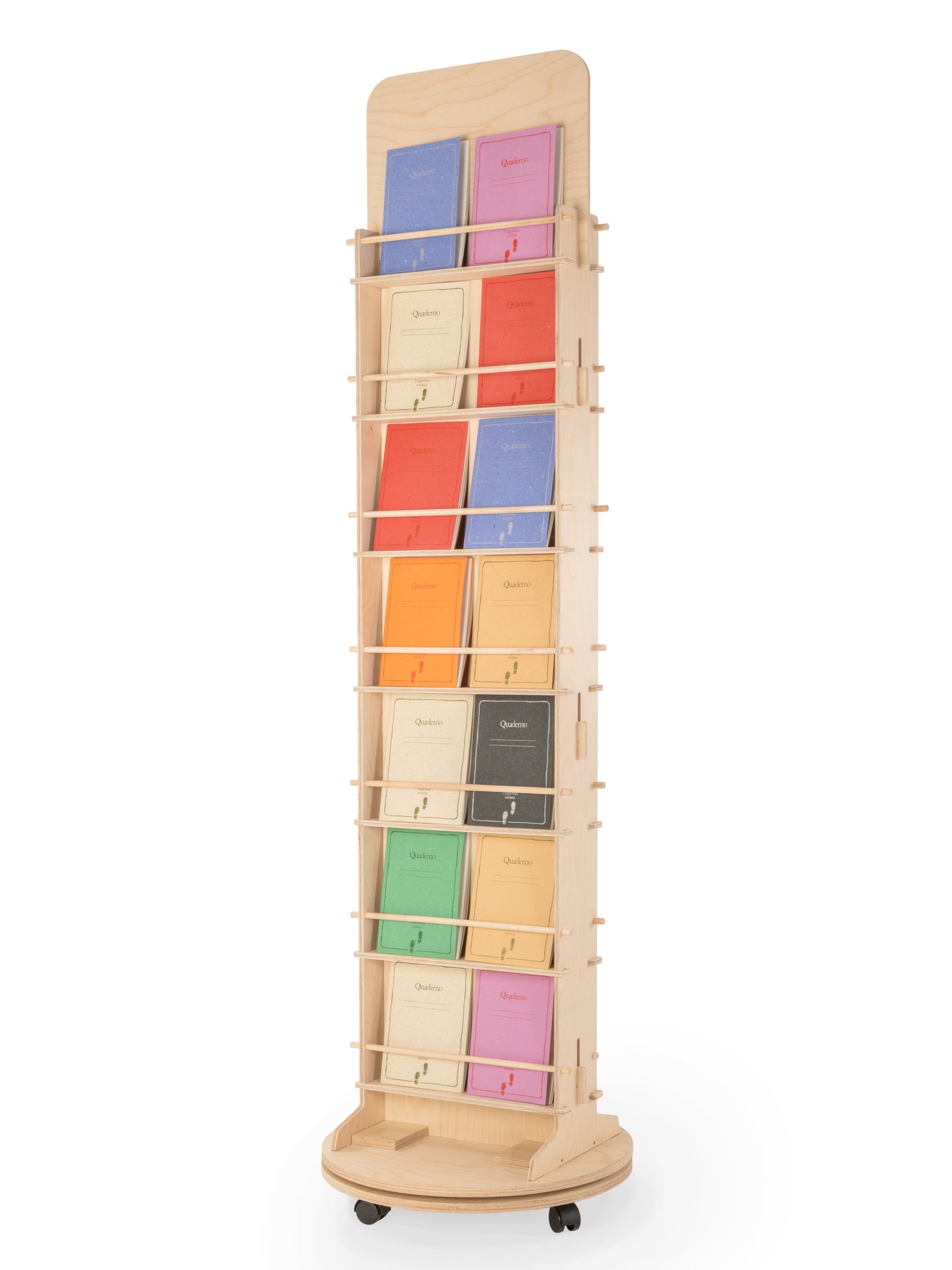 Avo Line: 360-degree rotating floor display, perfect for stores with limited space. Its 4 fixed shelves allow for vertical organization of notebooks, mugs, and gadgets.