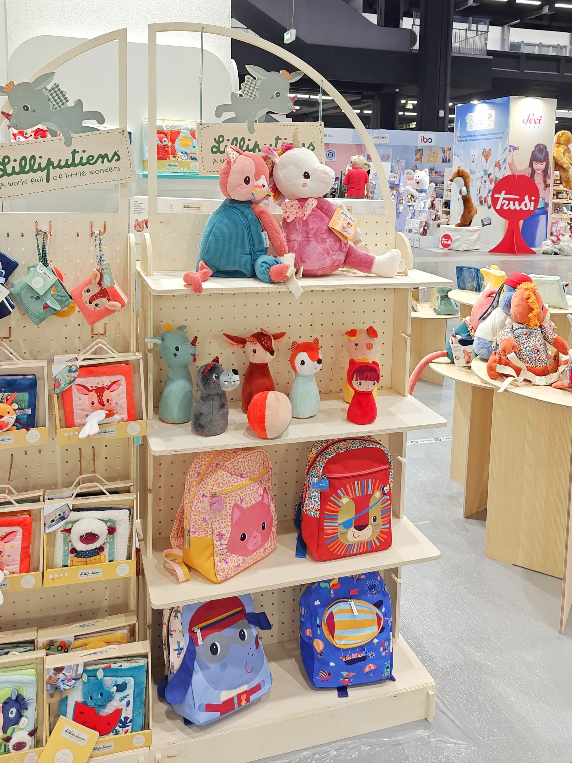 Wally Sei: A compact and multifunctional floor display that combines hooks and shelves, perfect for displaying both hanging and standing toys, optimizing every square inch.