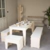 Banc rectangulaire multifonctionnel en MDF blanc avec système d'emboîtement | Siège design polyvalent et plateau d'affichage bas