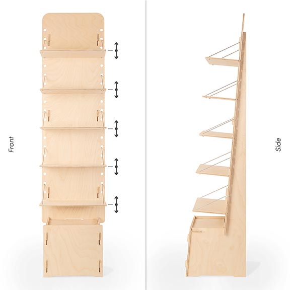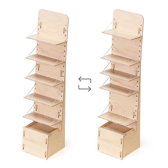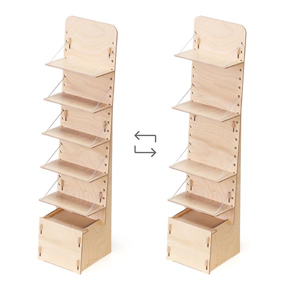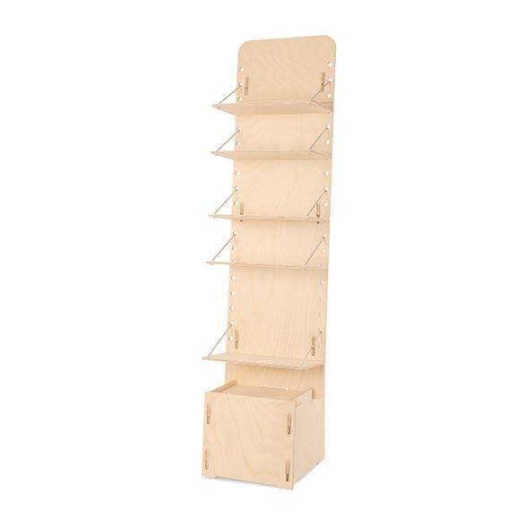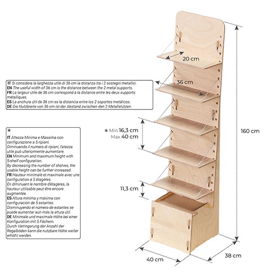 Grazie ai 5 ripiani mobili e inclinabili, si adatta con flessibilità a ogni tipo di prodotto e spazio espositivo, rendendolo perfetto sia per negozi che per fiere, mercatini e pop-up store.