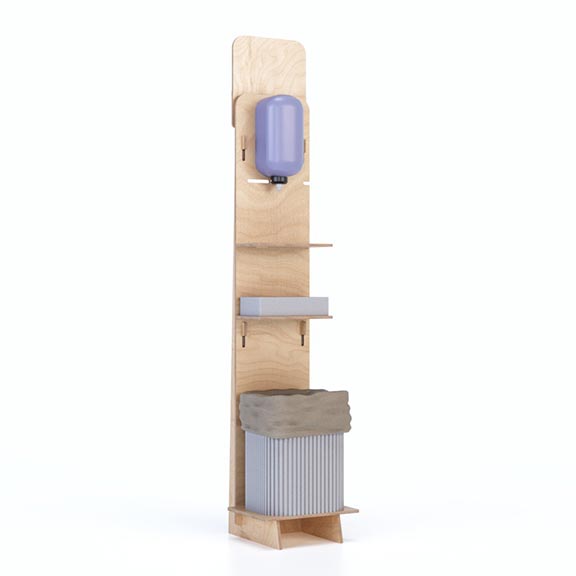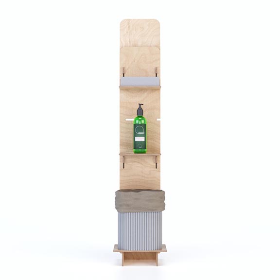 Dotato di due ripiani mobili dedicati alla scatola di guanti monouso e di uno spazio predisposto per un cestino gettacarte, Salus assicura un’organizzazione ordinata e igienica dei materiali di protezione personale. Il ripiano superiore è rifinito con una vernice trasparente, che facilita la pulizia e la manutenzione quotidiana, mantenendo l’espositore sempre impeccabile.